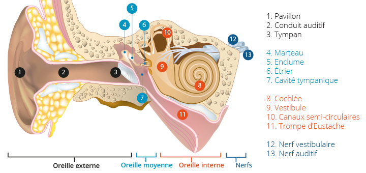 L’otite est une inflammation de l’oreille. Elle touche surtout les enfants du fait de la position plus horizontale de leur trompe d’Eustache. Elle peut concerner l’oreille externe, moyenne ou interne (cf. schéma anatomique de l’oreille ci-dessous). Ici, je m’attarderai sur l’otite moyenne aigüe qui est la plus courante chez l’enfant. Elle se caractérise par un épanchement purulent dans la cavité tympanique faisant souvent suite à une rhino-sinusite ou à une rhino-pharyngite atteignant la trompe d’Eustache.