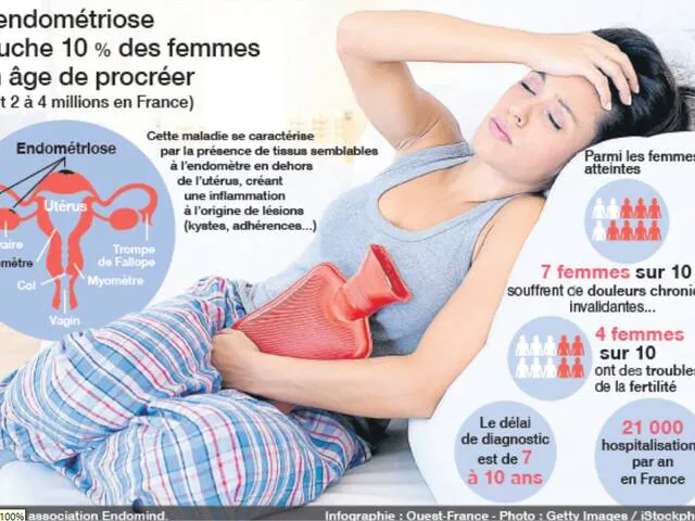 C’est une maladie inflammatoire chronique de l’appareil génital féminin. Elle correspond au développement de la muqueuse utérine, l’endomètre, en dehors de l’utérus colonisant d’autres organes. Les cellules endométriales qui ont migré sont sous l’influence des hormones ovariennes comme toute cellule endométriale, d’où le caractère cyclique des douleurs. On peut retrouver des foyers d’endométriose dans l’utérus (adénomyose), sur les ovaires (potentiel obstacle à la fécondation), les trompes (favorisant les GEU : grossesses extra-utérines), sur la face externe des anses intestinales, au niveau de la vessie, du vagin et plus rarement sur les poumons et le cerveau. L’endométriose touche une femme sur dix en âge de procréer.